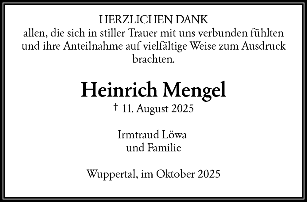 Hier finden Sie alle Traueranzeigen aus der Zeitung, die bisher für Heinrich Mengel erschienen sind. Weitere Traueranzeigen, die in der Zeitung erscheinen, werden hier ebenfalls aufgelistet