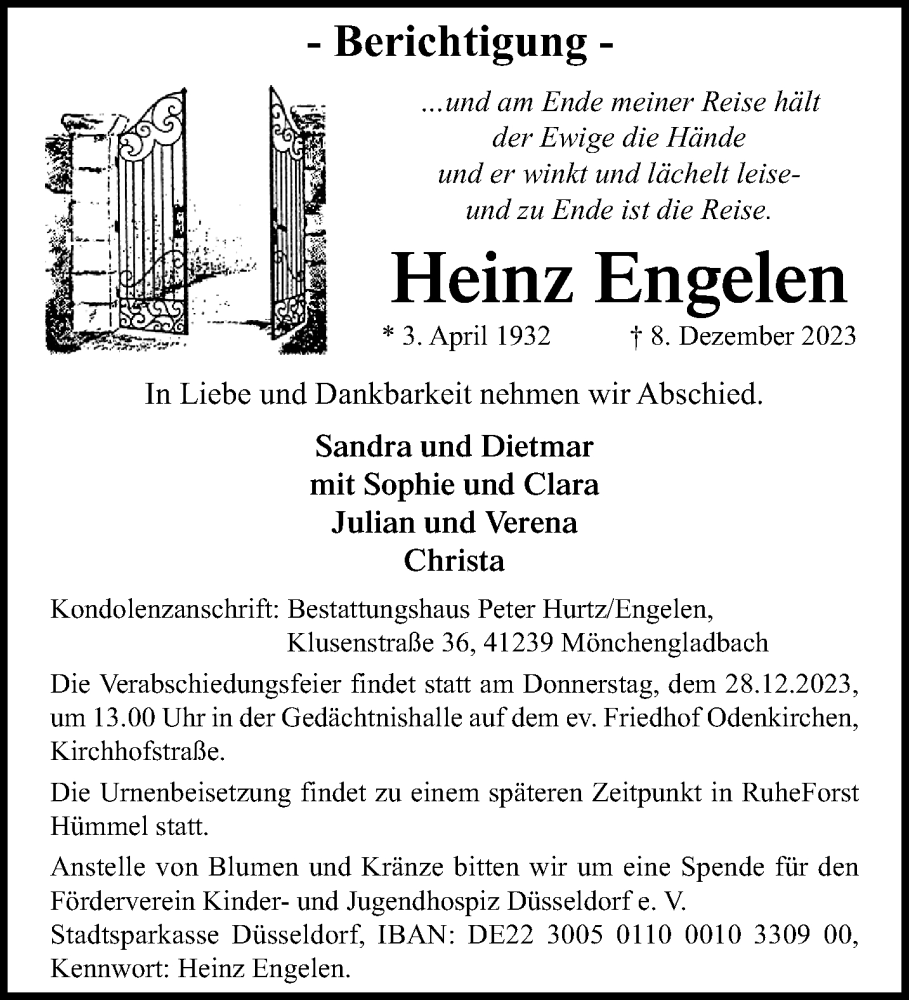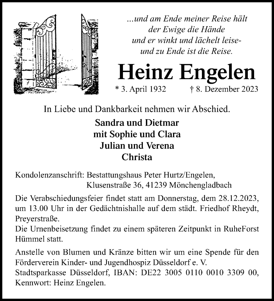 Hier finden Sie alle Traueranzeigen aus der Zeitung, die bisher für Heinz Engelen erschienen sind. Weitere Traueranzeigen, die in der Zeitung erscheinen, werden hier ebenfalls aufgelistet