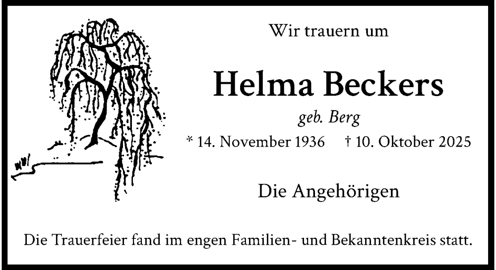 Hier finden Sie alle Traueranzeigen aus der Zeitung, die bisher für Helma Beckers erschienen sind. Weitere Traueranzeigen, die in der Zeitung erscheinen, werden hier ebenfalls aufgelistet