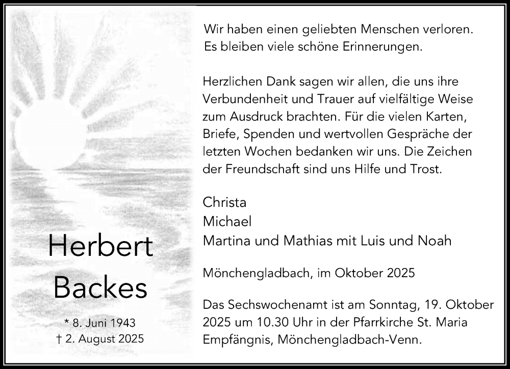 Hier finden Sie alle Traueranzeigen aus der Zeitung, die bisher für Herbert Backes erschienen sind. Weitere Traueranzeigen, die in der Zeitung erscheinen, werden hier ebenfalls aufgelistet