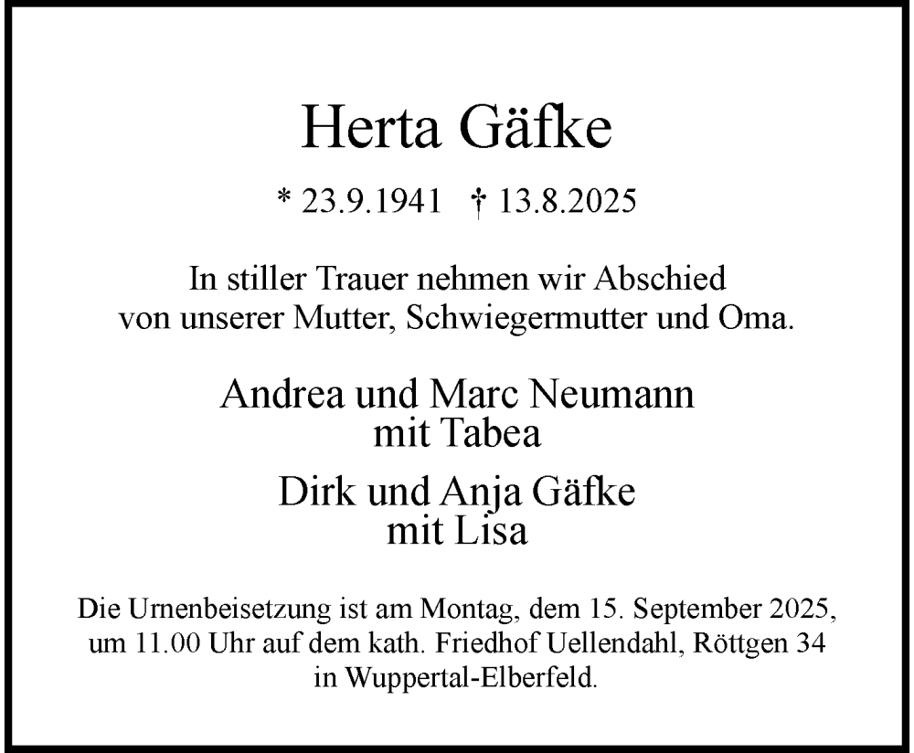 Hier finden Sie alle Traueranzeigen aus der Zeitung, die bisher für Herta Gäfke erschienen sind. Weitere Traueranzeigen, die in der Zeitung erscheinen, werden hier ebenfalls aufgelistet