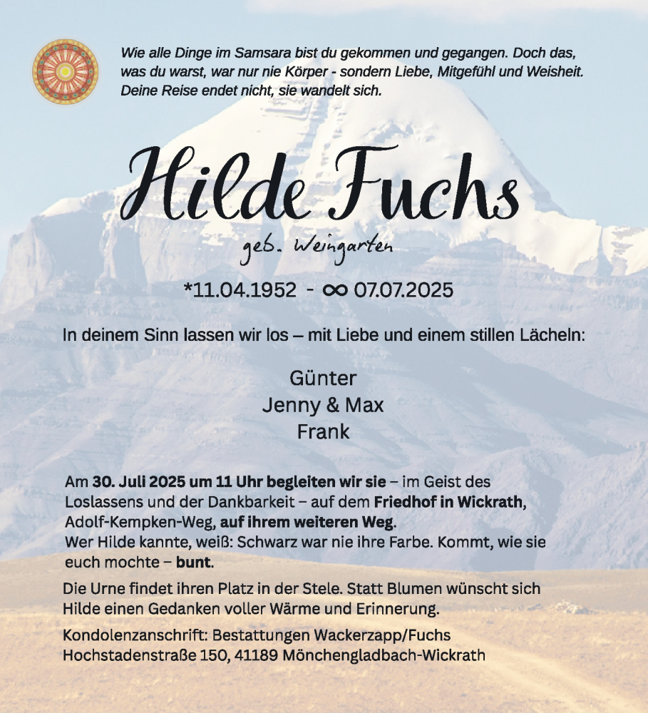 Hier finden Sie alle Traueranzeigen aus der Zeitung, die bisher für Hilde Fuchs erschienen sind. Weitere Traueranzeigen, die in der Zeitung erscheinen, werden hier ebenfalls aufgelistet