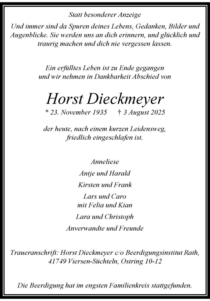 Hier finden Sie alle Traueranzeigen aus der Zeitung, die bisher für Horst Dieckmeyer erschienen sind. Weitere Traueranzeigen, die in der Zeitung erscheinen, werden hier ebenfalls aufgelistet