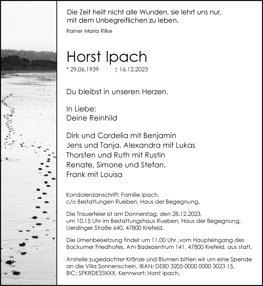 Hier finden Sie alle Traueranzeigen aus der Zeitung, die bisher für Horst Ipach erschienen sind. Weitere Traueranzeigen, die in der Zeitung erscheinen, werden hier ebenfalls aufgelistet