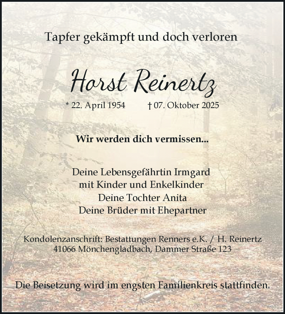 Hier finden Sie alle Traueranzeigen aus der Zeitung, die bisher für Horst Reinertz erschienen sind. Weitere Traueranzeigen, die in der Zeitung erscheinen, werden hier ebenfalls aufgelistet