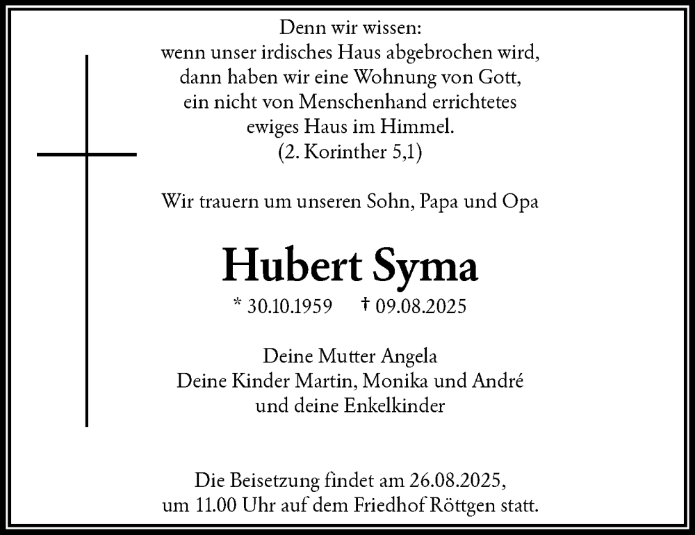 Hier finden Sie alle Traueranzeigen aus der Zeitung, die bisher für Hubert Syma erschienen sind. Weitere Traueranzeigen, die in der Zeitung erscheinen, werden hier ebenfalls aufgelistet