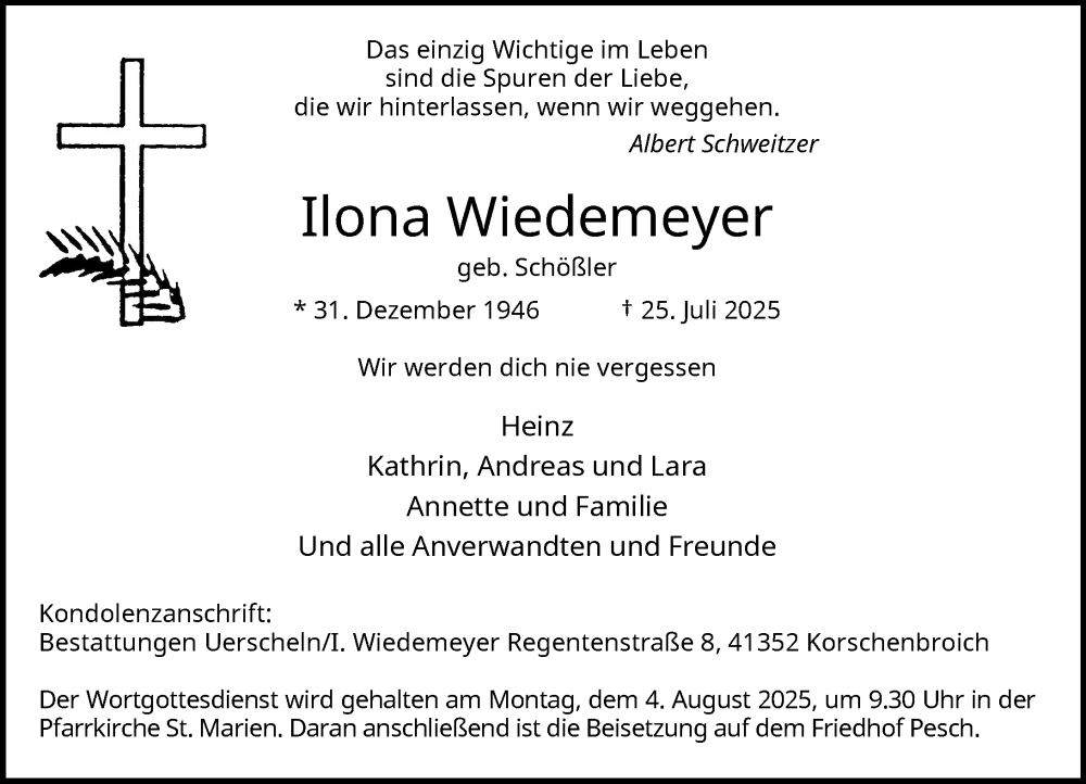 Hier finden Sie alle Traueranzeigen aus der Zeitung, die bisher für Ilona Wiedemeyer erschienen sind. Weitere Traueranzeigen, die in der Zeitung erscheinen, werden hier ebenfalls aufgelistet
