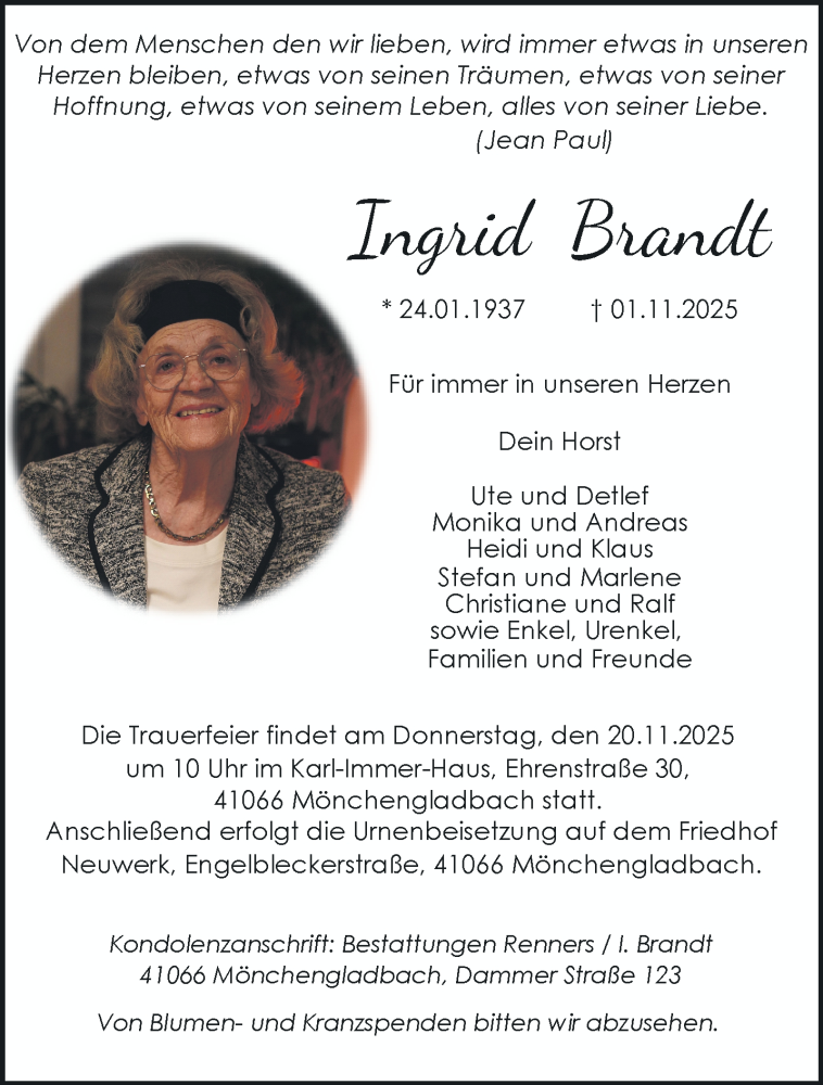 Hier finden Sie alle Traueranzeigen aus der Zeitung, die bisher für Ingrid Brandt erschienen sind. Weitere Traueranzeigen, die in der Zeitung erscheinen, werden hier ebenfalls aufgelistet