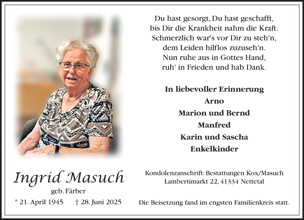 Hier finden Sie alle Traueranzeigen aus der Zeitung, die bisher für Ingrid Masuch erschienen sind. Weitere Traueranzeigen, die in der Zeitung erscheinen, werden hier ebenfalls aufgelistet