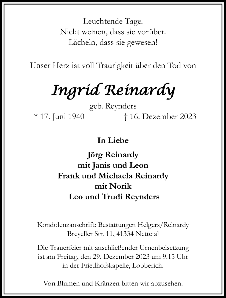 Hier finden Sie alle Traueranzeigen aus der Zeitung, die bisher für Ingrid Reinardy erschienen sind. Weitere Traueranzeigen, die in der Zeitung erscheinen, werden hier ebenfalls aufgelistet