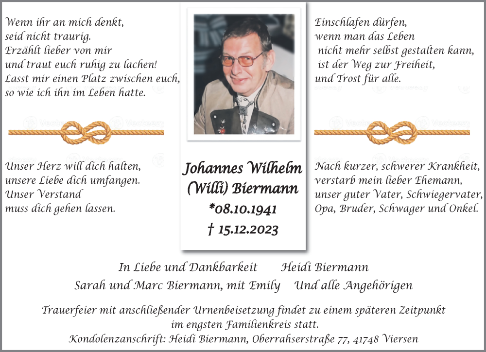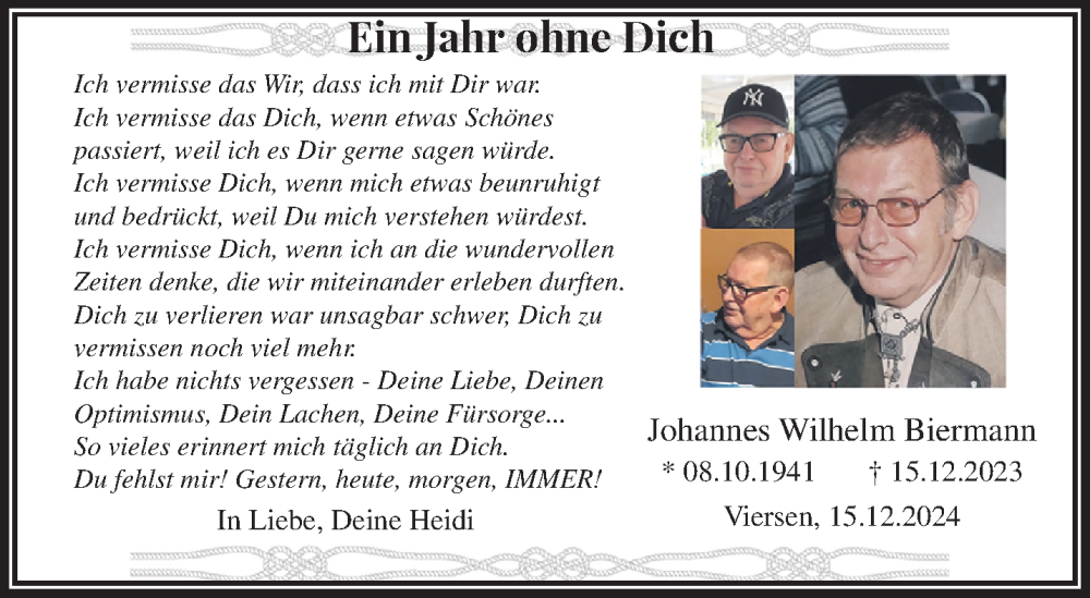 Hier finden Sie alle Traueranzeigen aus der Zeitung, die bisher für Johannes Wilhelm Biermann erschienen sind. Weitere Traueranzeigen, die in der Zeitung erscheinen, werden hier ebenfalls aufgelistet