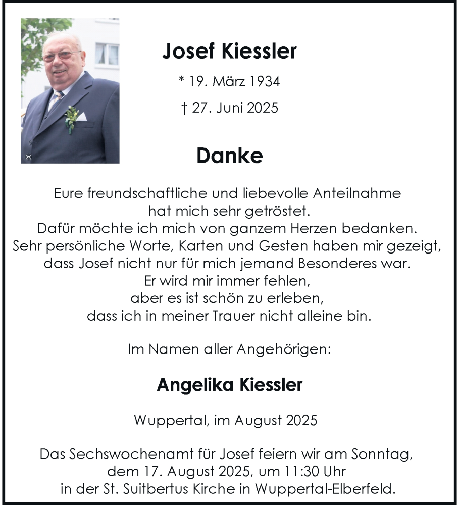Hier finden Sie alle Traueranzeigen aus der Zeitung, die bisher für Josef Kiessler erschienen sind. Weitere Traueranzeigen, die in der Zeitung erscheinen, werden hier ebenfalls aufgelistet
