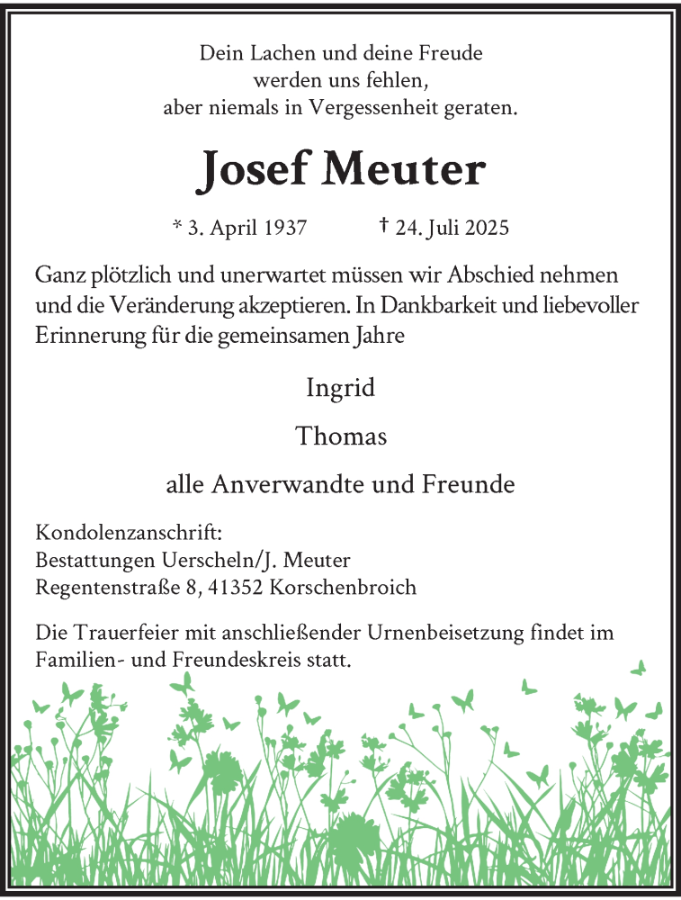 Hier finden Sie alle Traueranzeigen aus der Zeitung, die bisher für Josef Meuter erschienen sind. Weitere Traueranzeigen, die in der Zeitung erscheinen, werden hier ebenfalls aufgelistet