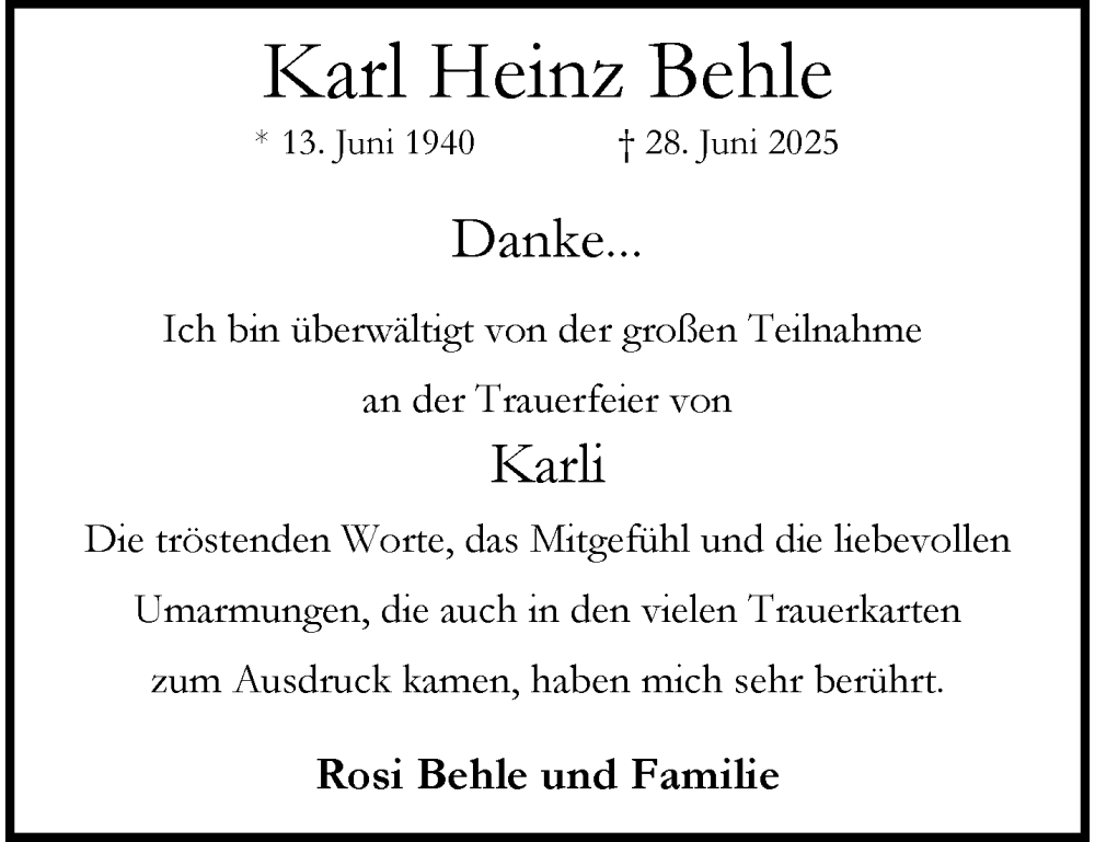 Hier finden Sie alle Traueranzeigen aus der Zeitung, die bisher für Karl Heinz Behle erschienen sind. Weitere Traueranzeigen, die in der Zeitung erscheinen, werden hier ebenfalls aufgelistet