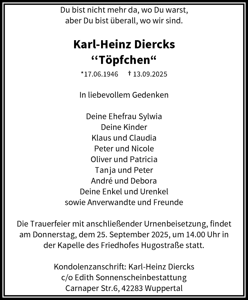 Hier finden Sie alle Traueranzeigen aus der Zeitung, die bisher für Karl-Heinz Diercks erschienen sind. Weitere Traueranzeigen, die in der Zeitung erscheinen, werden hier ebenfalls aufgelistet