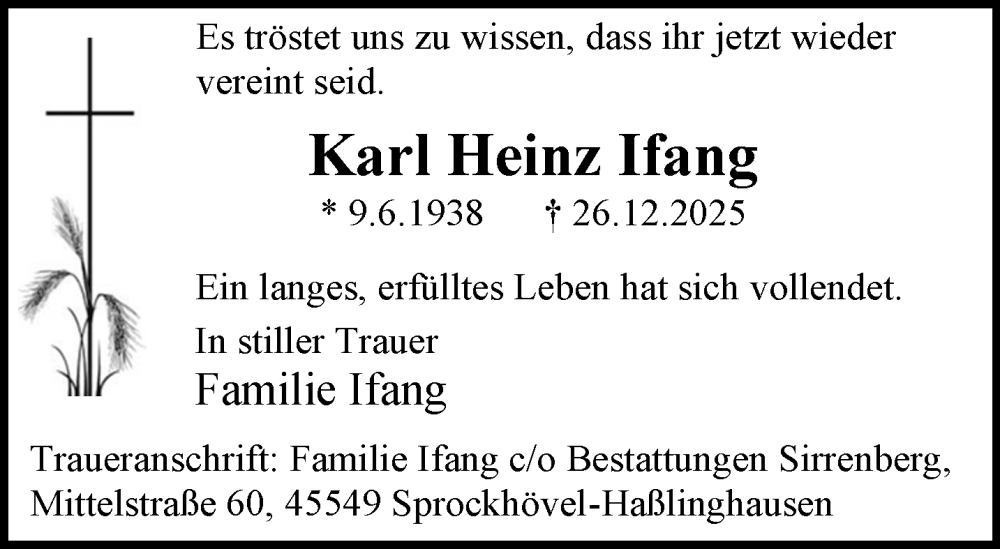 Hier finden Sie alle Traueranzeigen aus der Zeitung, die bisher für Karl Heinz Ifang erschienen sind. Weitere Traueranzeigen, die in der Zeitung erscheinen, werden hier ebenfalls aufgelistet
