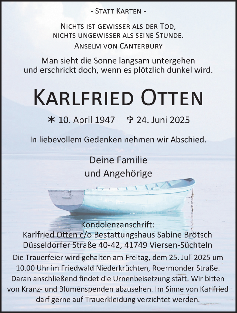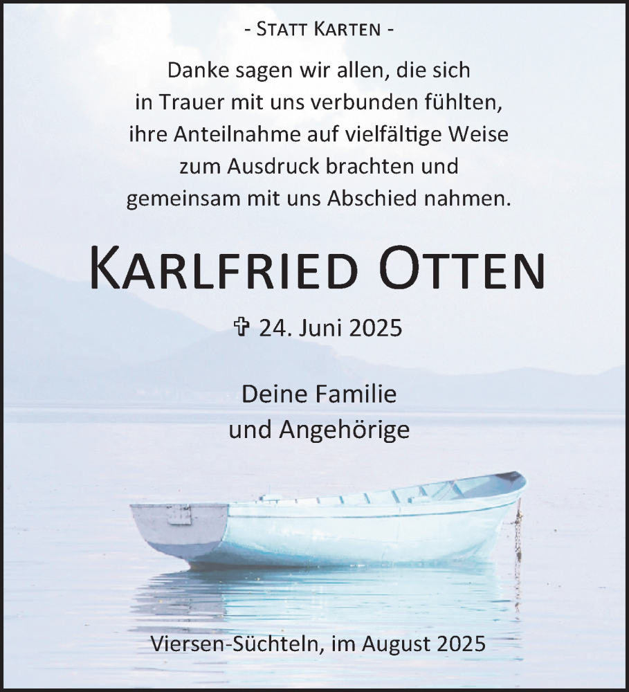 Hier finden Sie alle Traueranzeigen aus der Zeitung, die bisher für Karlfried Otten erschienen sind. Weitere Traueranzeigen, die in der Zeitung erscheinen, werden hier ebenfalls aufgelistet