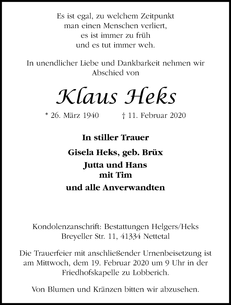Hier finden Sie alle Traueranzeigen aus der Zeitung, die bisher für Klaus Heks erschienen sind. Weitere Traueranzeigen, die in der Zeitung erscheinen, werden hier ebenfalls aufgelistet