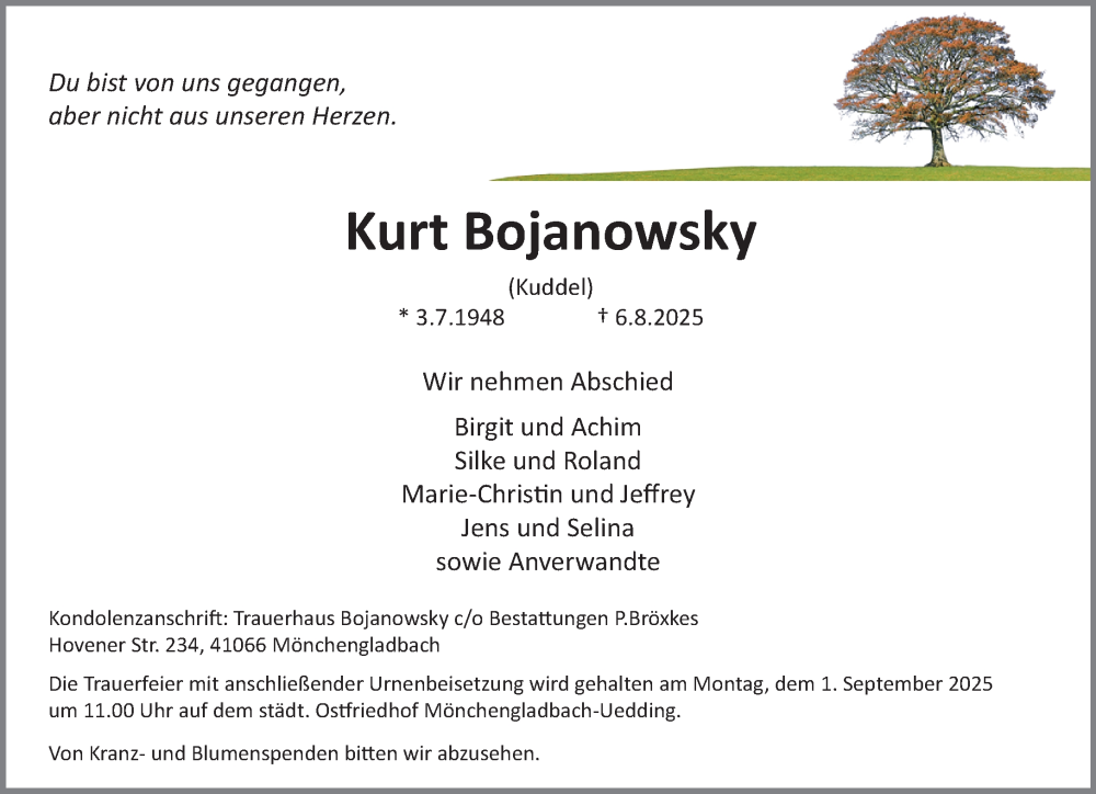 Hier finden Sie alle Traueranzeigen aus der Zeitung, die bisher für Kurt Bojanowsky erschienen sind. Weitere Traueranzeigen, die in der Zeitung erscheinen, werden hier ebenfalls aufgelistet