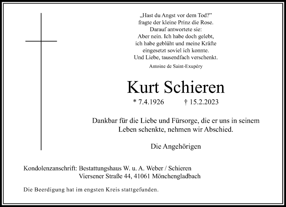 Hier finden Sie alle Traueranzeigen aus der Zeitung, die bisher für Kurt Schieren erschienen sind. Weitere Traueranzeigen, die in der Zeitung erscheinen, werden hier ebenfalls aufgelistet