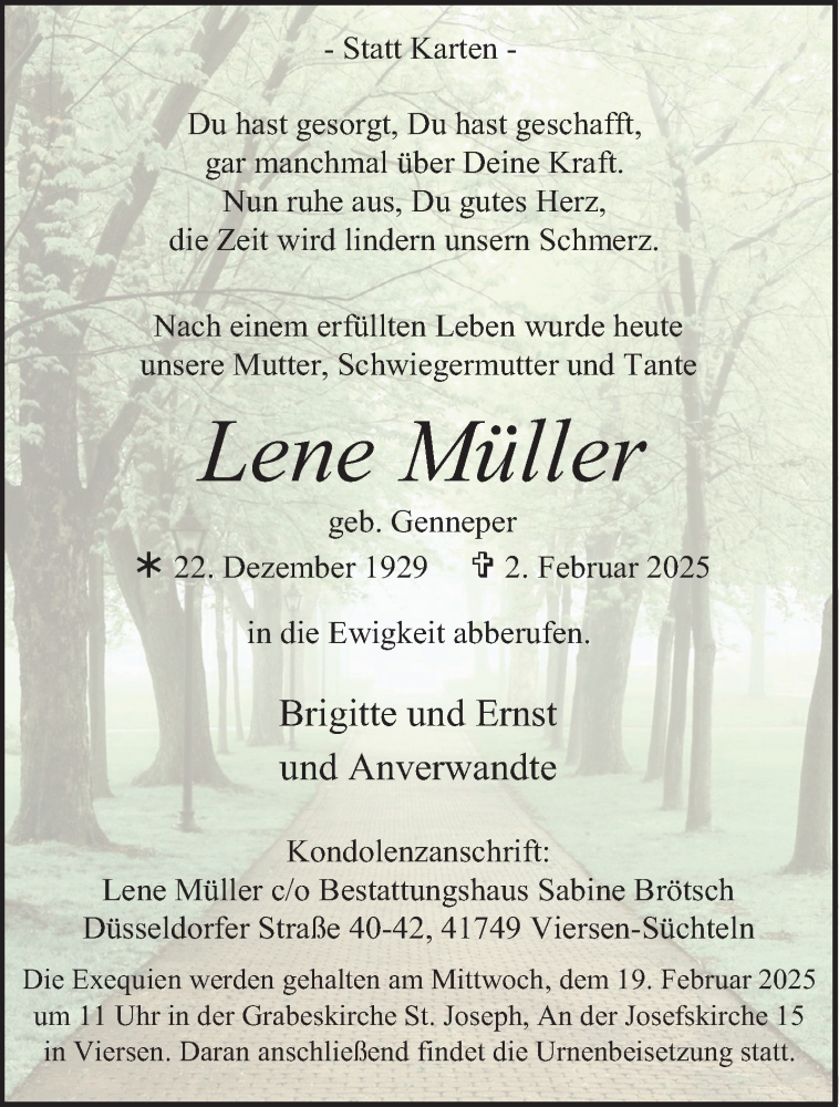 Hier finden Sie alle Traueranzeigen aus der Zeitung, die bisher für Lene Müller erschienen sind. Weitere Traueranzeigen, die in der Zeitung erscheinen, werden hier ebenfalls aufgelistet