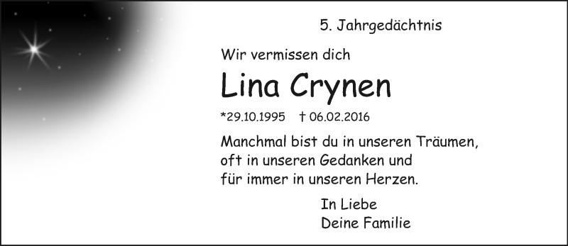 Hier finden Sie alle Traueranzeigen aus der Zeitung, die bisher für Lina Crynen erschienen sind. Weitere Traueranzeigen, die in der Zeitung erscheinen, werden hier ebenfalls aufgelistet
