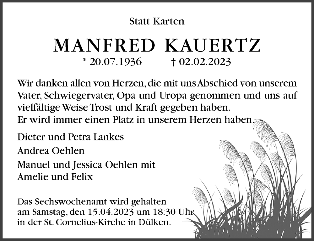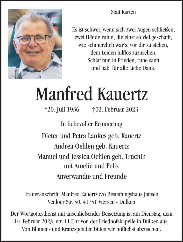 Hier finden Sie alle Traueranzeigen aus der Zeitung, die bisher für Manfred Kauertz erschienen sind. Weitere Traueranzeigen, die in der Zeitung erscheinen, werden hier ebenfalls aufgelistet