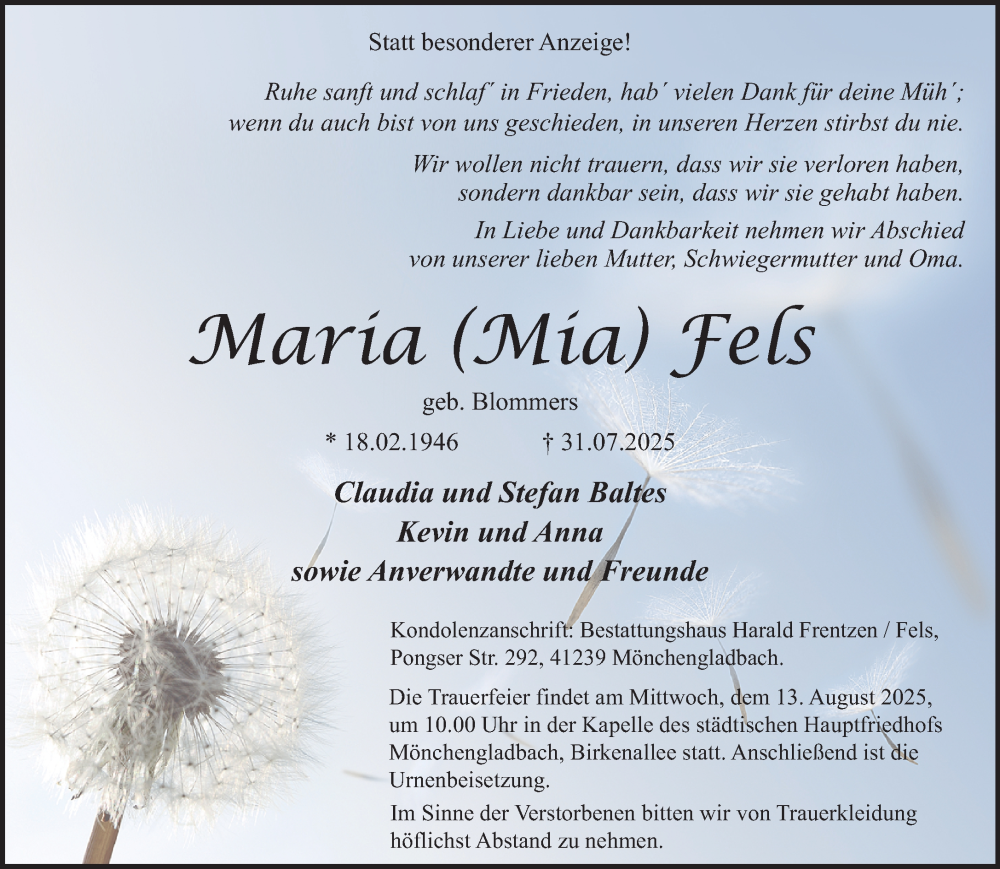 Hier finden Sie alle Traueranzeigen aus der Zeitung, die bisher für Maria Fels erschienen sind. Weitere Traueranzeigen, die in der Zeitung erscheinen, werden hier ebenfalls aufgelistet