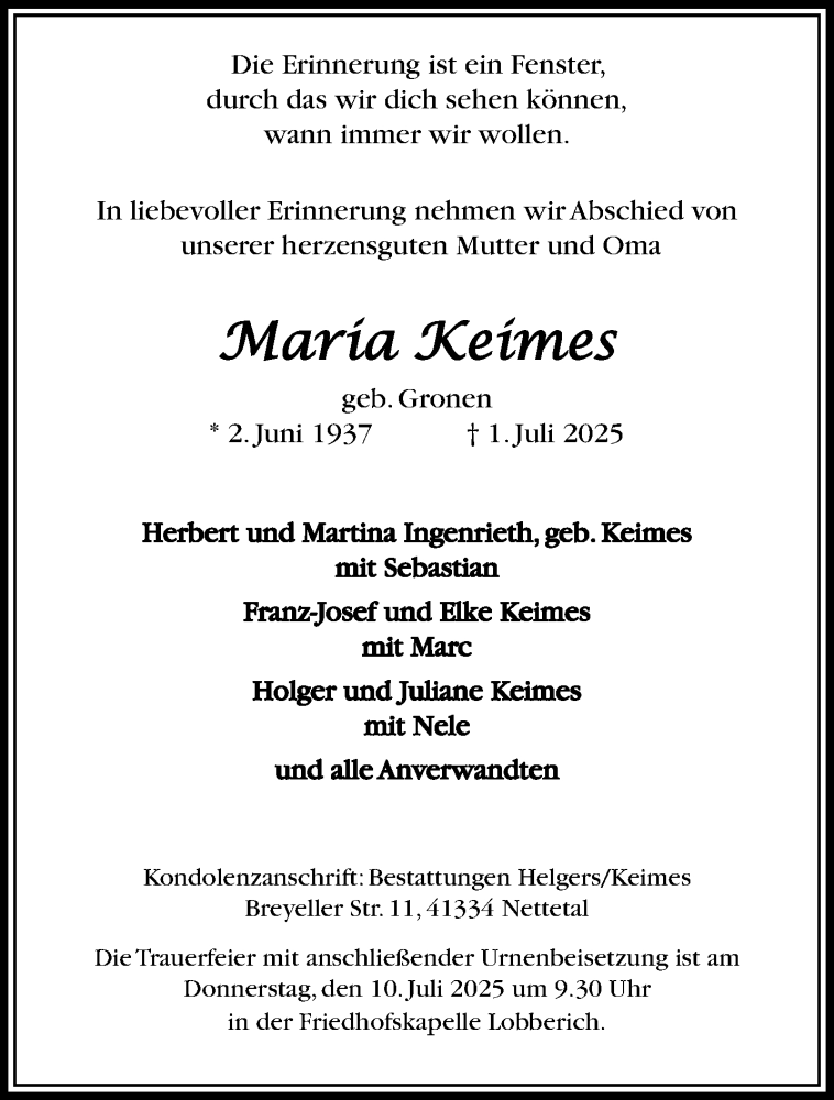 Hier finden Sie alle Traueranzeigen aus der Zeitung, die bisher für Maria Keimes erschienen sind. Weitere Traueranzeigen, die in der Zeitung erscheinen, werden hier ebenfalls aufgelistet