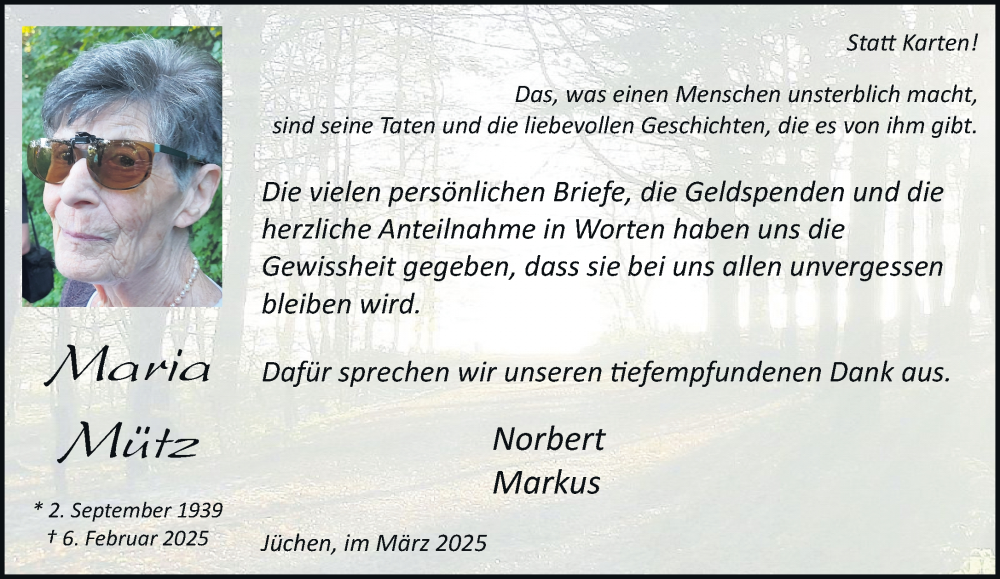 Hier finden Sie alle Traueranzeigen aus der Zeitung, die bisher für Maria Mütz erschienen sind. Weitere Traueranzeigen, die in der Zeitung erscheinen, werden hier ebenfalls aufgelistet