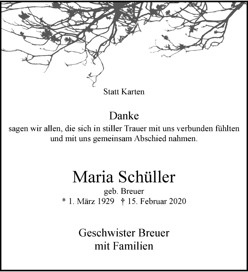 Hier finden Sie alle Traueranzeigen aus der Zeitung, die bisher für Maria Schüller erschienen sind. Weitere Traueranzeigen, die in der Zeitung erscheinen, werden hier ebenfalls aufgelistet