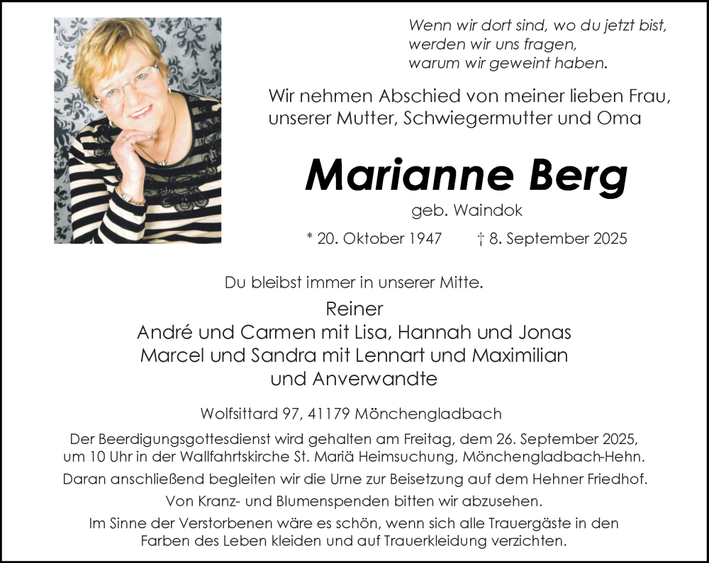 Hier finden Sie alle Traueranzeigen aus der Zeitung, die bisher für Marianne Berg erschienen sind. Weitere Traueranzeigen, die in der Zeitung erscheinen, werden hier ebenfalls aufgelistet