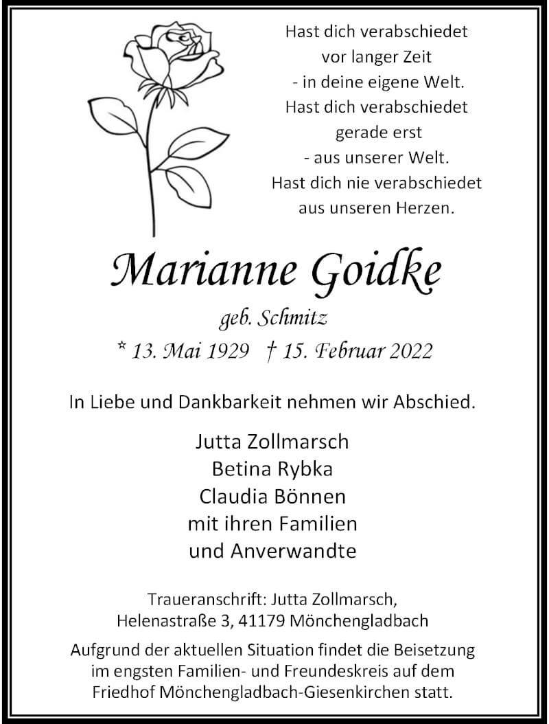 Hier finden Sie alle Traueranzeigen aus der Zeitung, die bisher für Marianne Goidke erschienen sind. Weitere Traueranzeigen, die in der Zeitung erscheinen, werden hier ebenfalls aufgelistet