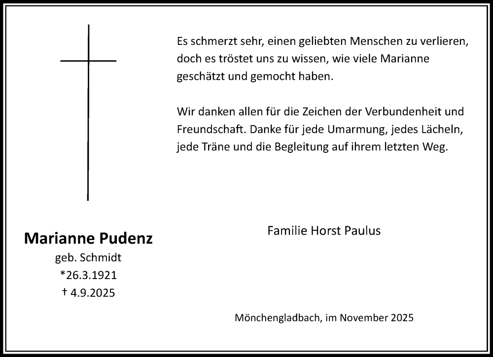 Hier finden Sie alle Traueranzeigen aus der Zeitung, die bisher für Marianne Pudenz erschienen sind. Weitere Traueranzeigen, die in der Zeitung erscheinen, werden hier ebenfalls aufgelistet
