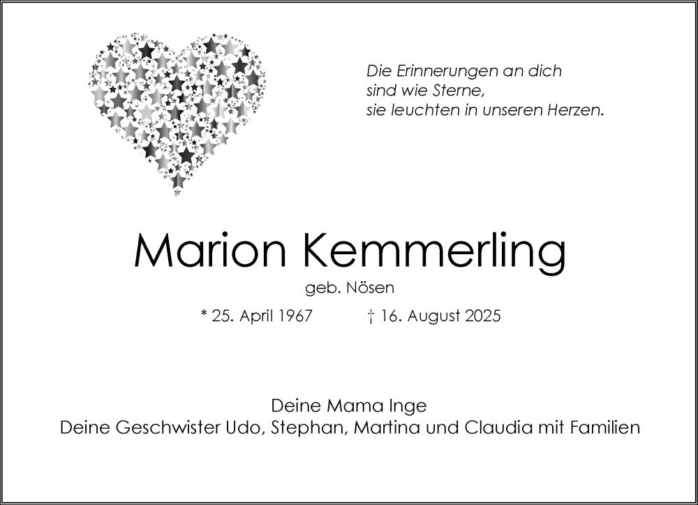 Hier finden Sie alle Traueranzeigen aus der Zeitung, die bisher für Marion Kemmerling erschienen sind. Weitere Traueranzeigen, die in der Zeitung erscheinen, werden hier ebenfalls aufgelistet