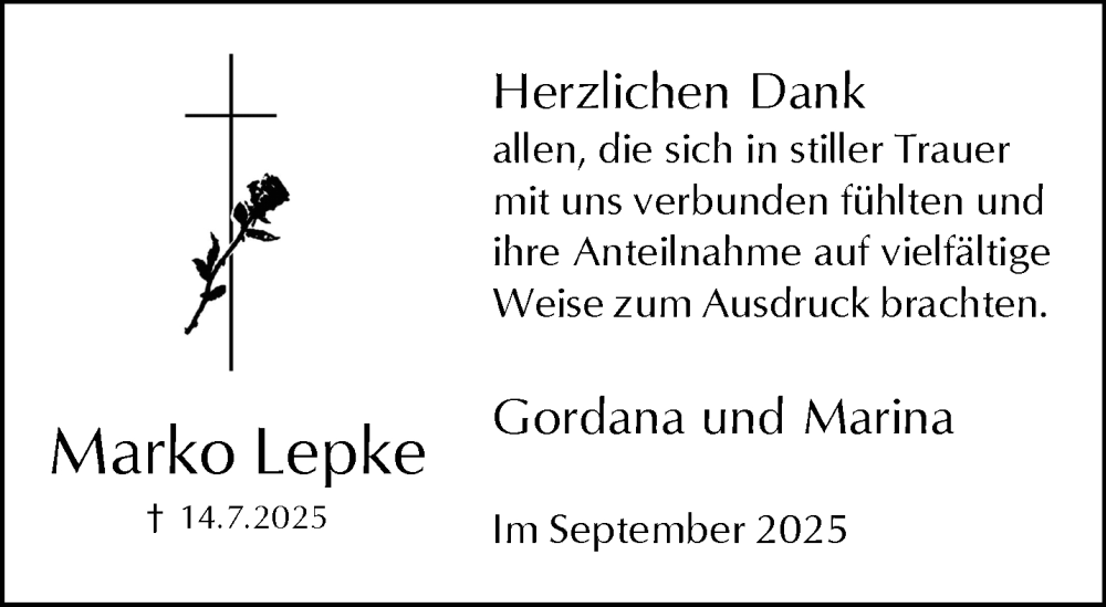 Hier finden Sie alle Traueranzeigen aus der Zeitung, die bisher für Marko Lepke erschienen sind. Weitere Traueranzeigen, die in der Zeitung erscheinen, werden hier ebenfalls aufgelistet