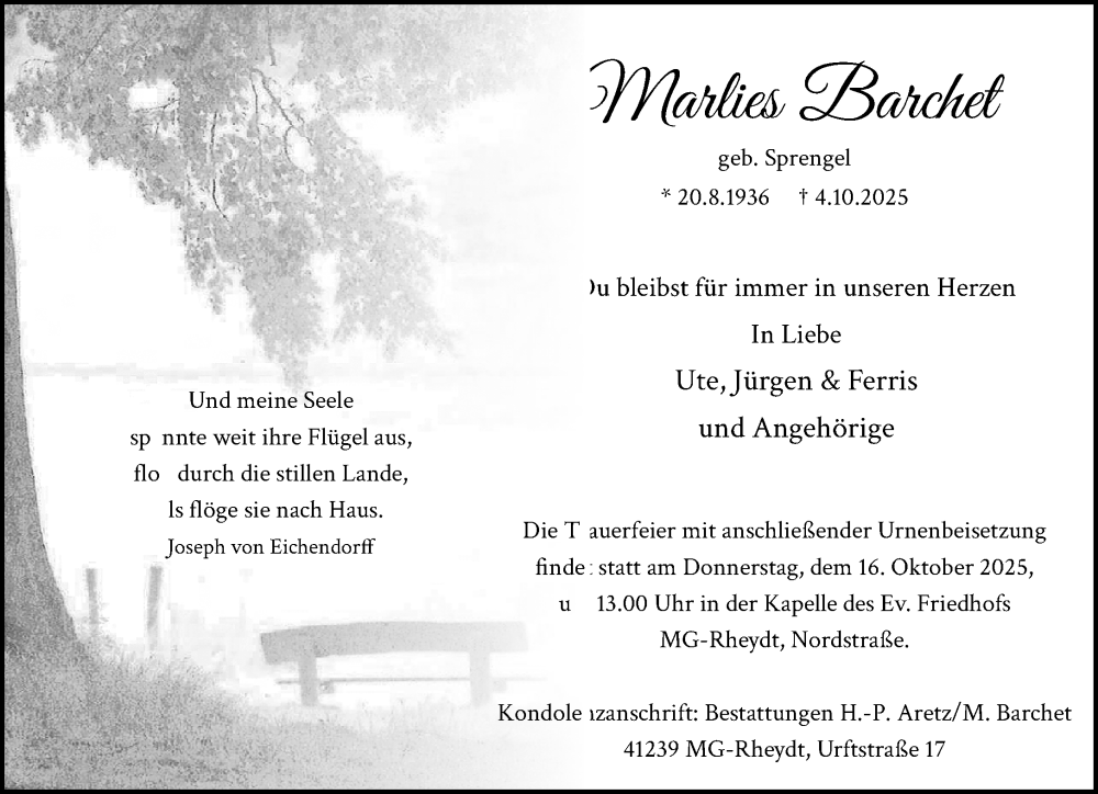 Hier finden Sie alle Traueranzeigen aus der Zeitung, die bisher für Marlies Barchet erschienen sind. Weitere Traueranzeigen, die in der Zeitung erscheinen, werden hier ebenfalls aufgelistet