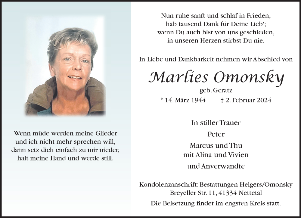 Hier finden Sie alle Traueranzeigen aus der Zeitung, die bisher für Marlies Omonsky erschienen sind. Weitere Traueranzeigen, die in der Zeitung erscheinen, werden hier ebenfalls aufgelistet