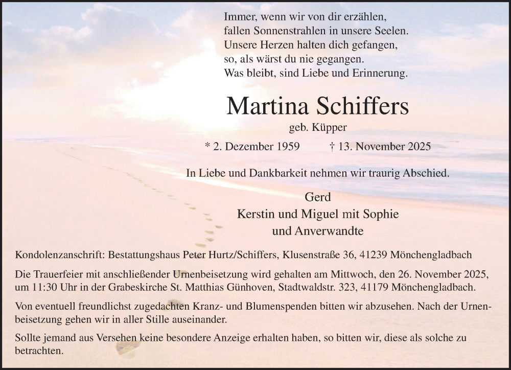 Hier finden Sie alle Traueranzeigen aus der Zeitung, die bisher für Martina Schiffers erschienen sind. Weitere Traueranzeigen, die in der Zeitung erscheinen, werden hier ebenfalls aufgelistet