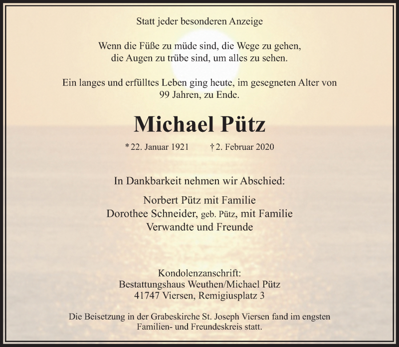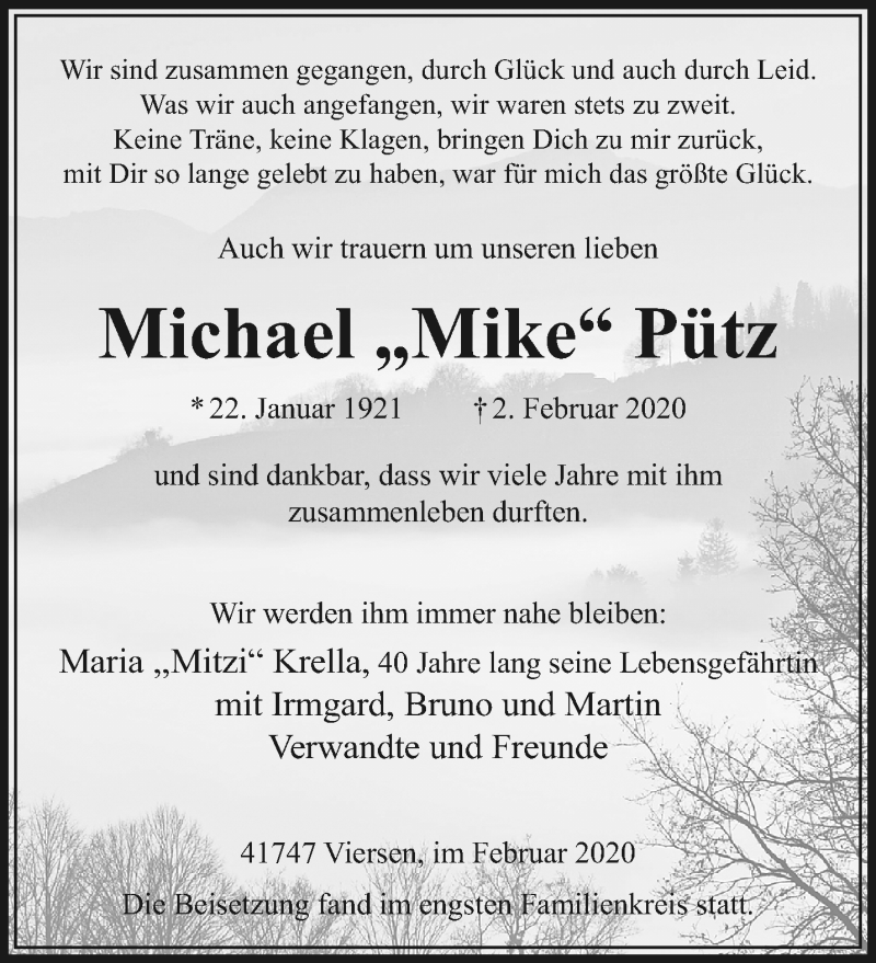 Hier finden Sie alle Traueranzeigen aus der Zeitung, die bisher für Michael Pütz erschienen sind. Weitere Traueranzeigen, die in der Zeitung erscheinen, werden hier ebenfalls aufgelistet