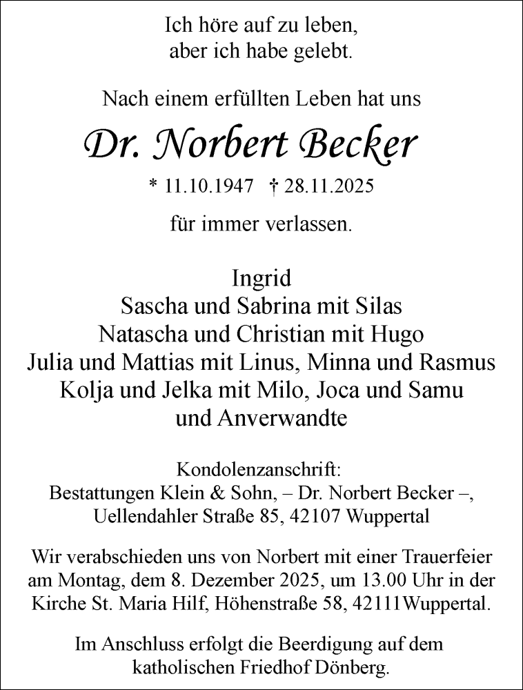 Hier finden Sie alle Traueranzeigen aus der Zeitung, die bisher für Norbert Becker erschienen sind. Weitere Traueranzeigen, die in der Zeitung erscheinen, werden hier ebenfalls aufgelistet