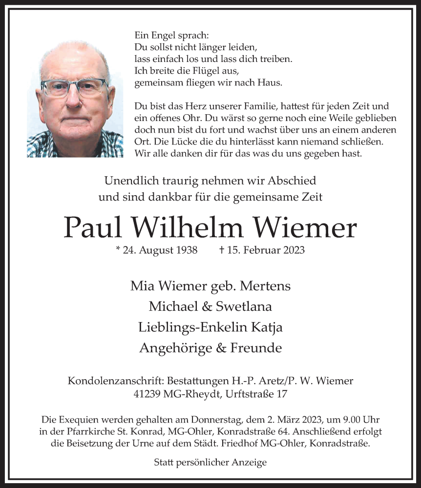 Hier finden Sie alle Traueranzeigen aus der Zeitung, die bisher für Paul Wilhelm Wiemer erschienen sind. Weitere Traueranzeigen, die in der Zeitung erscheinen, werden hier ebenfalls aufgelistet