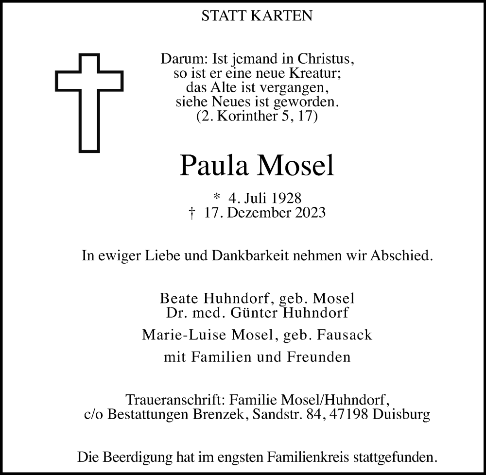 Hier finden Sie alle Traueranzeigen aus der Zeitung, die bisher für Paula Mosel erschienen sind. Weitere Traueranzeigen, die in der Zeitung erscheinen, werden hier ebenfalls aufgelistet