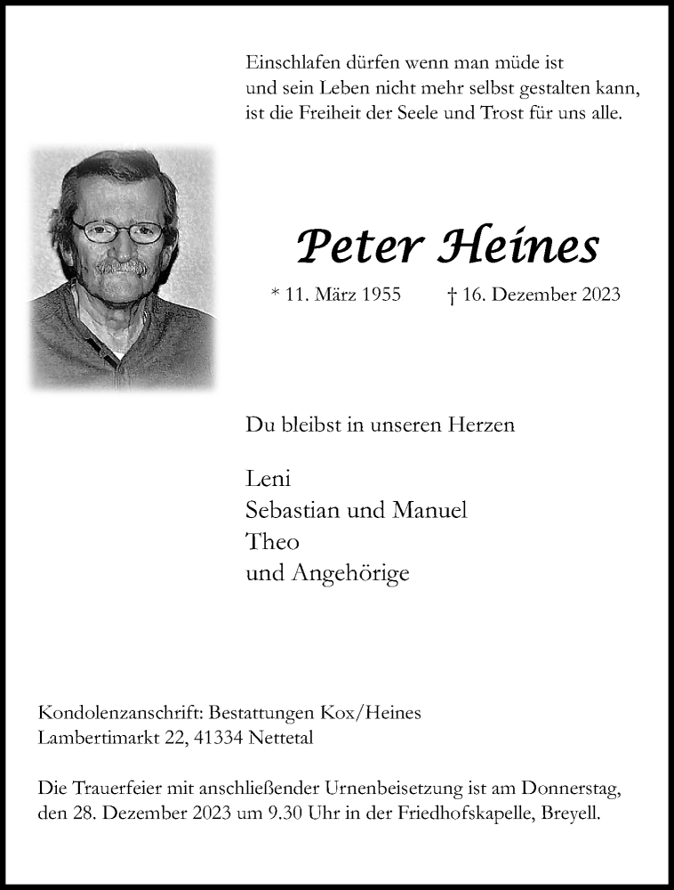 Hier finden Sie alle Traueranzeigen aus der Zeitung, die bisher für Peter Heines erschienen sind. Weitere Traueranzeigen, die in der Zeitung erscheinen, werden hier ebenfalls aufgelistet