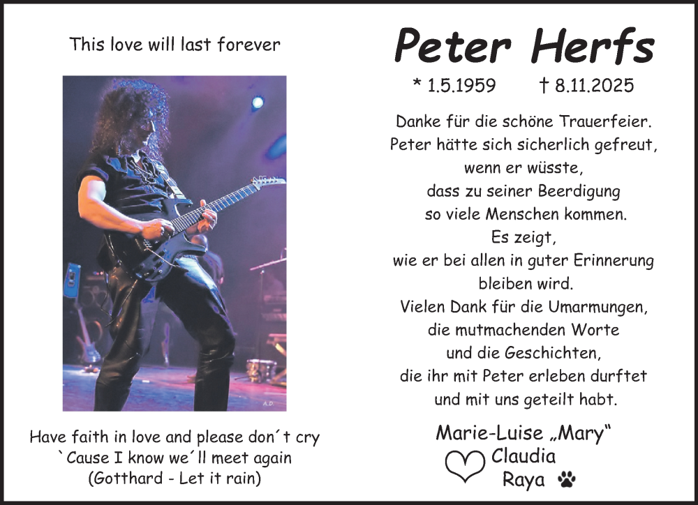 Hier finden Sie alle Traueranzeigen aus der Zeitung, die bisher für Peter Herfs erschienen sind. Weitere Traueranzeigen, die in der Zeitung erscheinen, werden hier ebenfalls aufgelistet