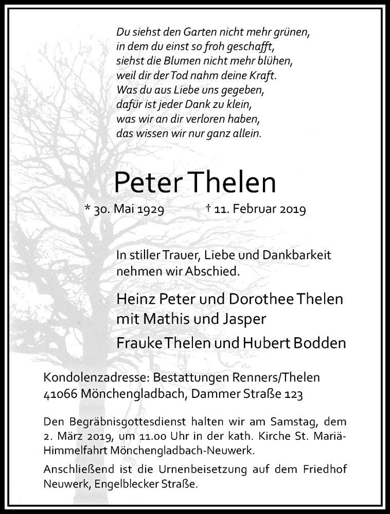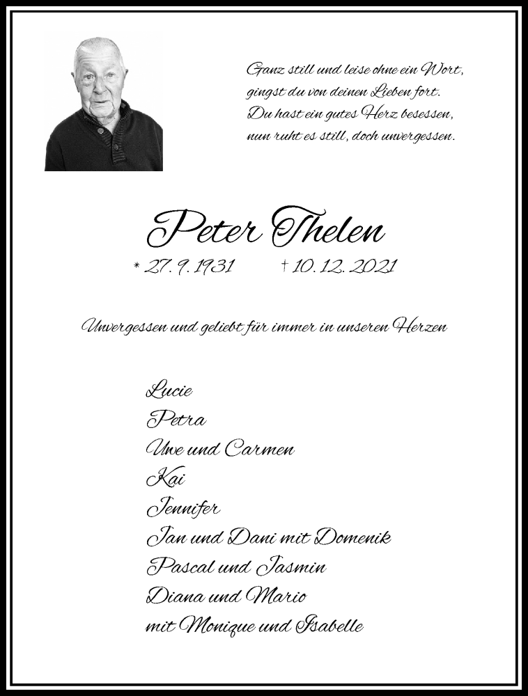 Hier finden Sie alle Traueranzeigen aus der Zeitung, die bisher für Peter Thelen erschienen sind. Weitere Traueranzeigen, die in der Zeitung erscheinen, werden hier ebenfalls aufgelistet