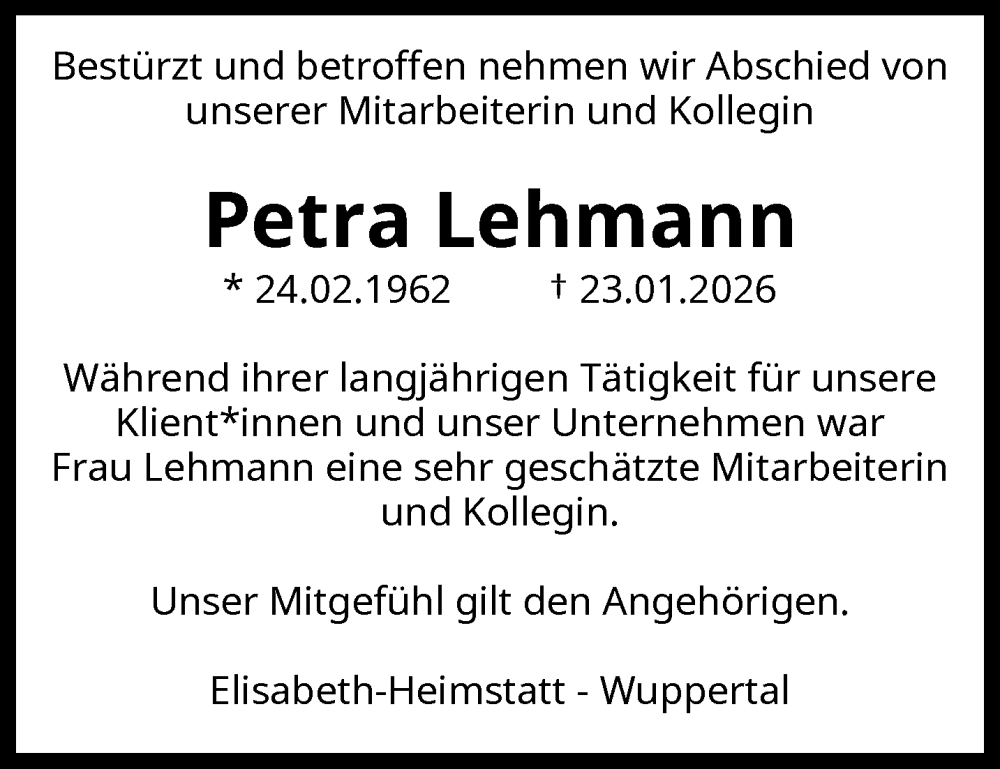 Hier finden Sie alle Traueranzeigen aus der Zeitung, die bisher für Petra Lehmann erschienen sind. Weitere Traueranzeigen, die in der Zeitung erscheinen, werden hier ebenfalls aufgelistet