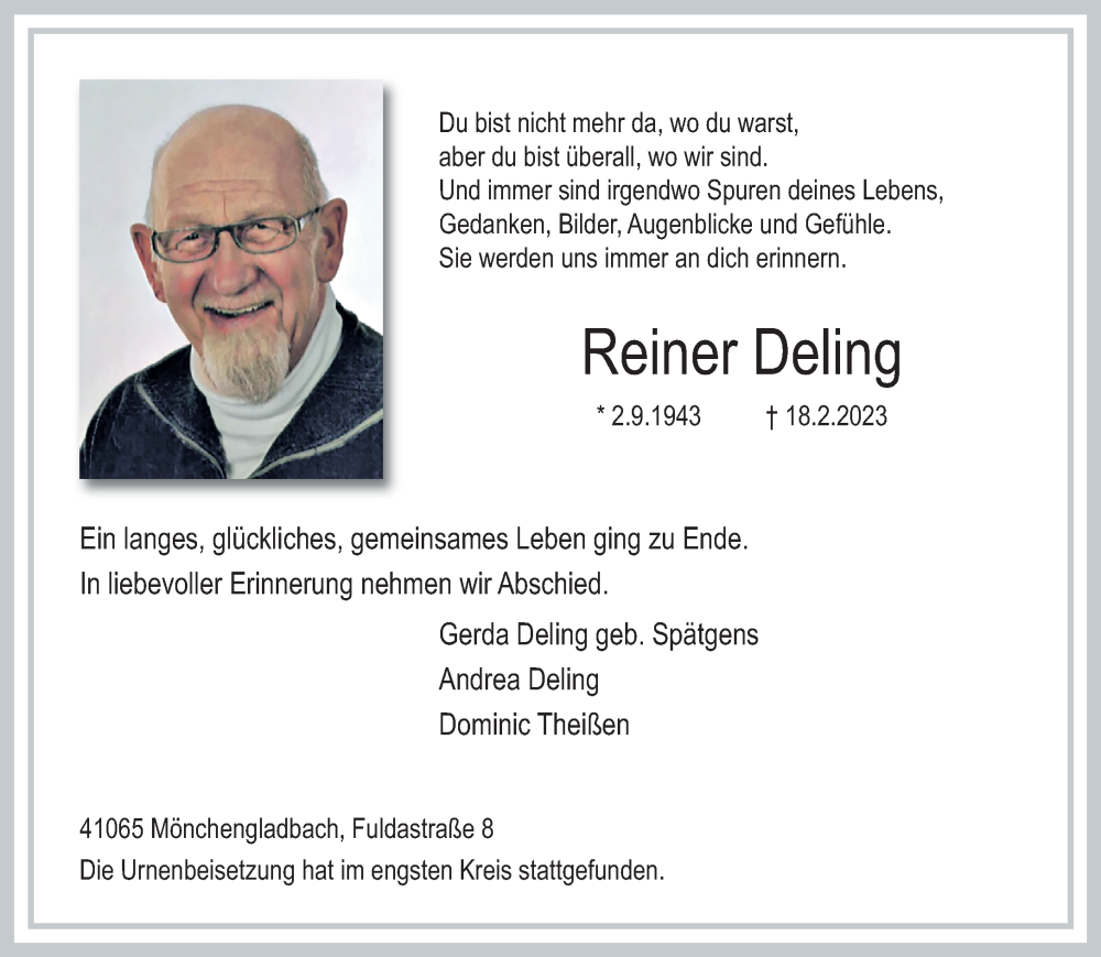 Hier finden Sie alle Traueranzeigen aus der Zeitung, die bisher für Reiner Deling erschienen sind. Weitere Traueranzeigen, die in der Zeitung erscheinen, werden hier ebenfalls aufgelistet
