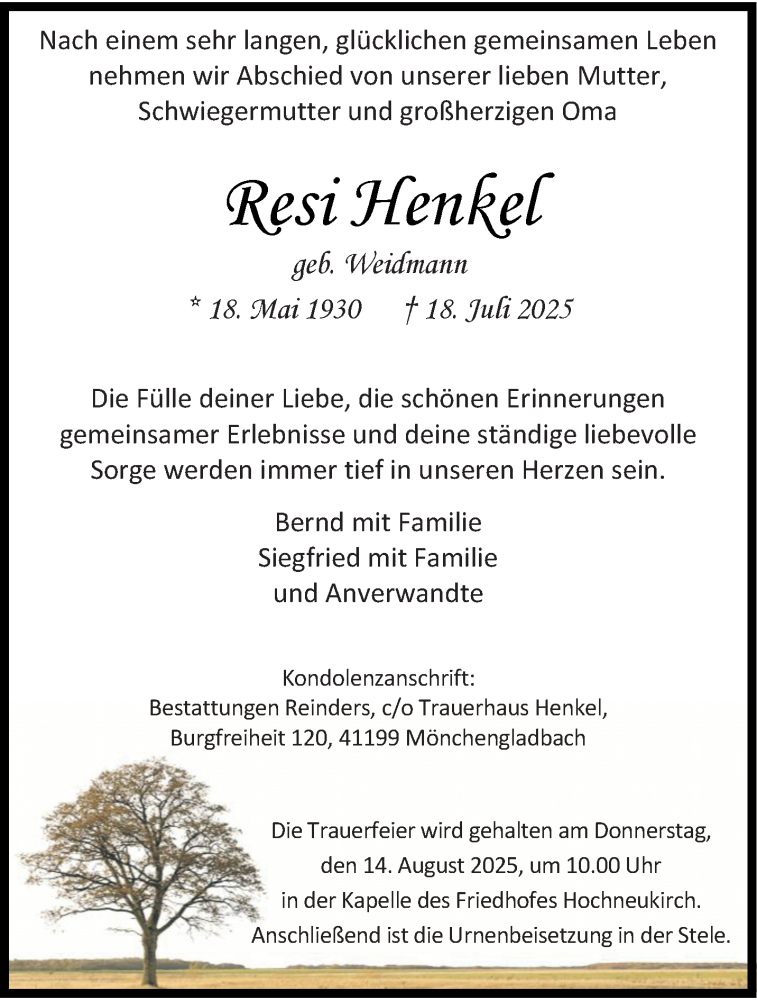 Hier finden Sie alle Traueranzeigen aus der Zeitung, die bisher für Resi Henkel erschienen sind. Weitere Traueranzeigen, die in der Zeitung erscheinen, werden hier ebenfalls aufgelistet