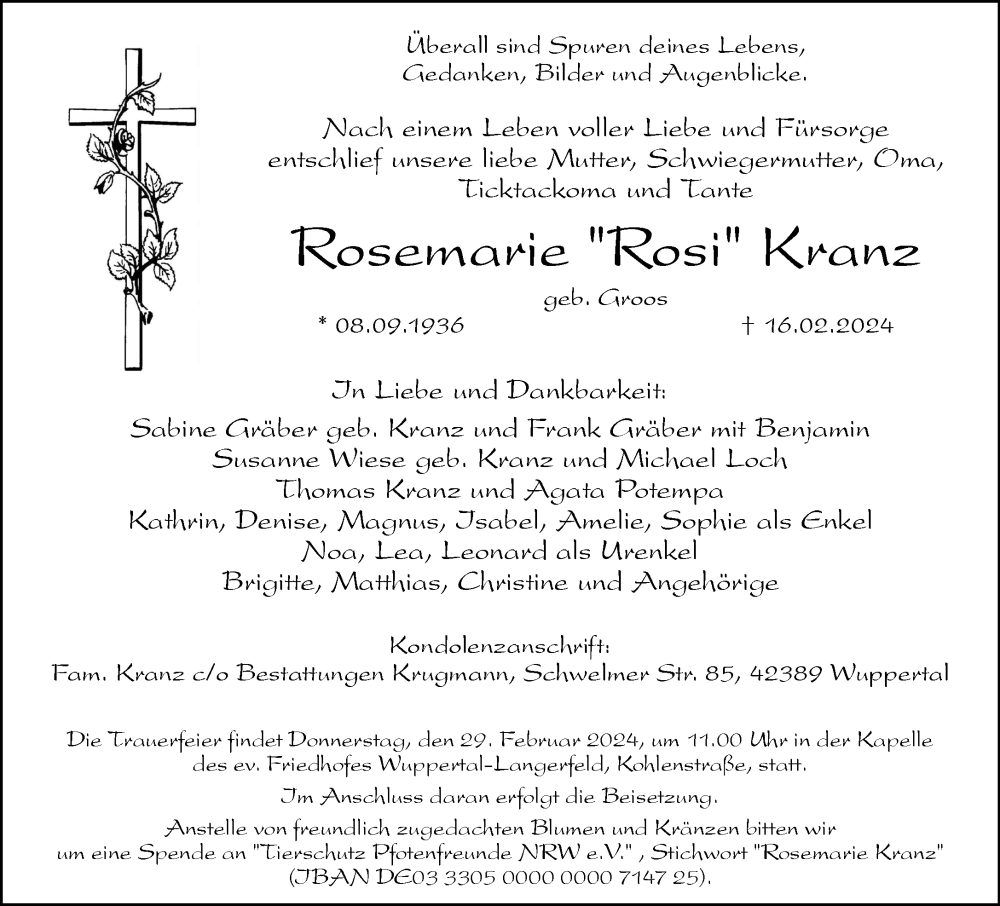 Hier finden Sie alle Traueranzeigen aus der Zeitung, die bisher für Rosemarie Kranz erschienen sind. Weitere Traueranzeigen, die in der Zeitung erscheinen, werden hier ebenfalls aufgelistet